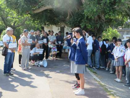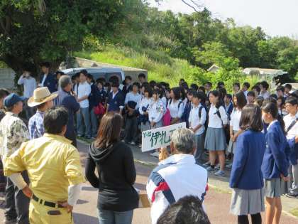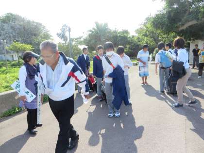 闘牛場のすぐ近くで、入市式(うるま市)を行い、その後、民家さんの後ろについていき、各車でそれぞれの民泊先に分かれました。