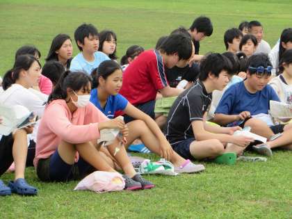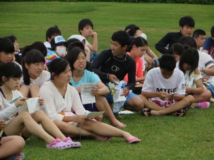 この写真は、荷物をすべてホテルに置いて、マリン体験の準備後、ホテル前に集合したときのようすです。