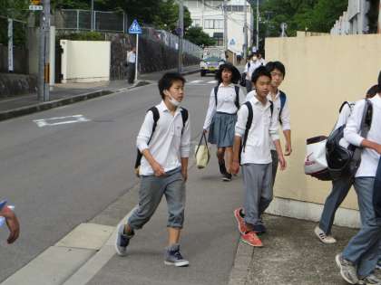 下の写真は、今朝の青空と登校風景、そして3年生の授業のようすです。
