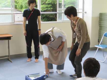 妊婦体験では、お腹がつかえて、床に置いてあるものは取りにくいものです。