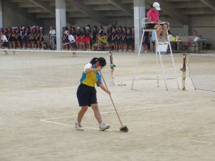 ソフトテニスの公式戦の合間にも、コート整備を黙々とする本校生徒の姿がありました。ご苦労様です。