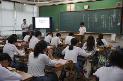 昨日8日の6限に、1年生の各クラスと5組では、小・中学校50名ほどの先生が集まり、「コミュニケーション能力を育成するための“言語活動の充実”」をテーマに教員の授業力向上を目指し、小中合同での研究授業が行われました。