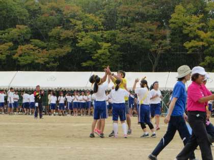 応援ももちろん頼もしいですが、最後の写真はリレーで1位となったのでしょうか。生徒(リレーメンバー)と先生が喜び合っています。