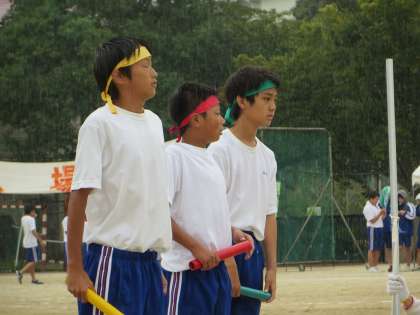ちょうど男子の競技が始まる少し前に雨が降り出し、一走選手がスタートラインに立つ頃には雨足が強まってきました。