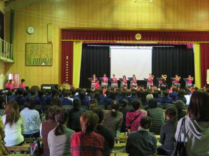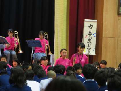 午後の部は吹奏楽部の演奏から始まりました。約30分ほどのステージで、「千と千尋メドレー」や「嵐メドレー」をはじめ4曲演奏され、観客を楽しませてくれました。最後はアンコールのかけ声と手拍子が起こり、「シング・シング・シング」で締めくくられ、大きな拍手とともに吹奏楽部の発表は終了しました。
