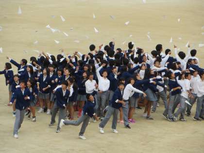 次の写真は、3年生の発表として見た映像のラストシーンにあった、平和を願い、紙飛行機を3年生全員で飛ばしているときのようすです。