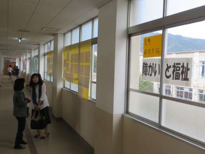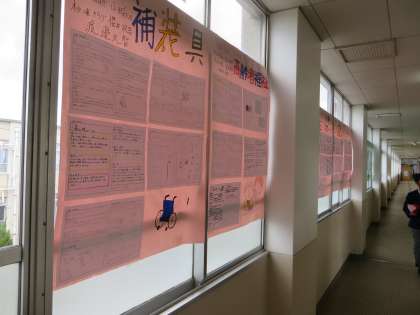 アイマスク体験や点字学習などもしましたが、それらをもとに、「視覚障がい」「高齢者福祉」「障がい者スポーツ」など6つのテーマに分かれ、それぞれを一人ずつが取り組み、壁新聞形式で発表しました。