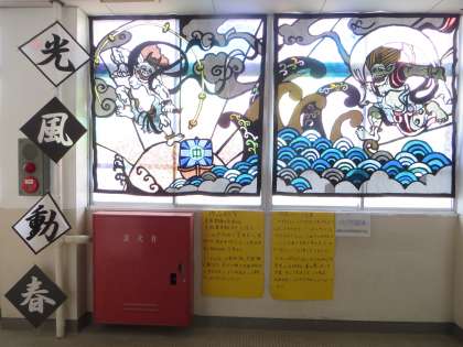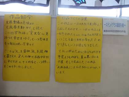 なお、この2・3枚目の写真は、文化の部の展示ではありませんが、美術部のみんなが一緒になってつくった作品(ステンドグラス調の「風神・雷神」を表現したもの)です。