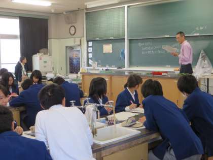 下の写真は、授業体験のようすです。まずは1組の「理科」から。