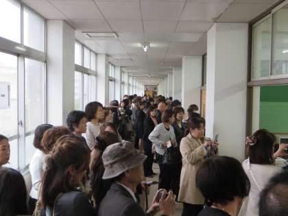 教室前の廊下には、たくさんのご家族の皆さんに来ていただき、自席に座る皆さんのようすに目を細めながら、担任の先生のお話に耳を傾けていただきました。