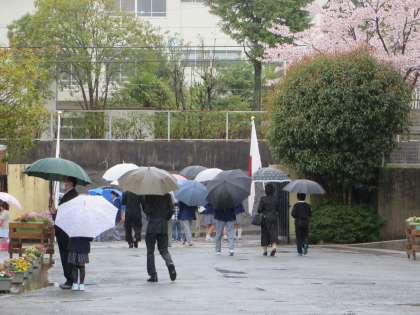 この頃、雨は本格的に降り、いつもなら学級開きが終わった後は、正門付近の桜をバックに記念の写真撮影が始まるのですが、あいにくの雨のため、この日は早々と家路につく姿が目につきました。