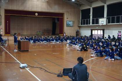 この会は、大きく分けると2部構成からなり、5限目に洛西中学校の生徒会活動、とくに各委員会の活動についての紹介をする“生徒会オリエンテーション”を、6限目には各部の活動のようすを伝える“部活動オリエンテーション”を実施しました。