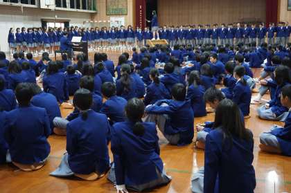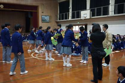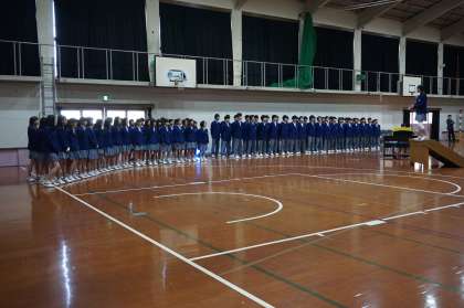 こちらの写真は、2・3年生の歓迎の合唱のようすと、生徒会から各クラスの代表に、学級ボールと鉢植えの花が渡されているところです。