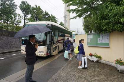 学校前から,3台のバスに分乗し京都駅に向かいます。小雨が降る中,大きな荷物を運ぶのは少し大変そうですが,8時20分に元気に出発しました。修学旅行のスローガンは「118人の夢探しの旅! Let's Go To Tokyo!」。一生の思い出になることを祈ります。