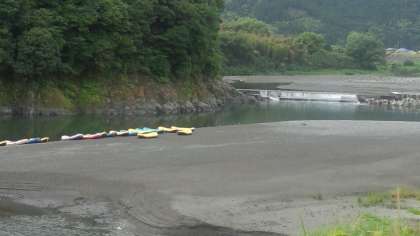 富士川のラフティングの出発地点へ向かっているところです。ボートの写っている所が、その出発地点です。この時点で、雨が再びポツポツと…。でも、大丈夫です。きっと。