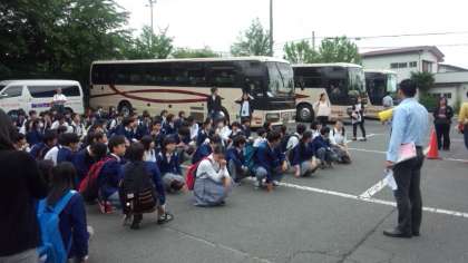 お世話になった大池ホテルの方々に感謝の気持ちを伝え,午前8時,予定通りに東京に向け出発しました。バスの中では昨日の疲れがまだ取れずに寝ている人がたくさんいます。今日の国会議事堂とディズニーランドに向けて,体力を蓄えています。なお,写真の中で,集合している生徒の向こうに見えるレンガ色の建物が宿泊したホテルです。
