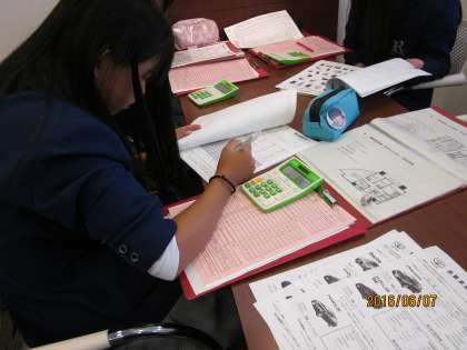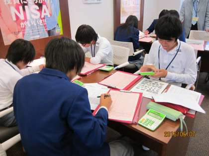 学習は,まず生徒にカードが渡されることから始まります。このカードに,年収や家族構成が書かれています。これは一人ひとり条件が変えてあります。その後,それぞれの店舗にカードを取りに行きます。商品の価格が書かれているので,それも参考に,食費や住居費など自分がどのくらい支出していくかを決めていきます。洛西中学校PTA・2年学年委員さんにも来ていただき,ボランティアで生徒の学習の支援をしてくださいました。