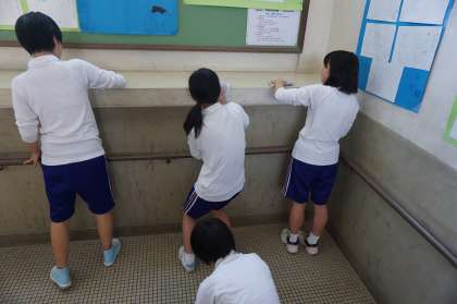 6月10日(金)6時間目,全生徒が校内一斉清掃に取り組みました。各学年で分かれて,廊下・階段を“みがき”ました。生徒会環境委員長より,校内放送でねらいと清掃分担の説明があり,そのあと軽快な音楽が流れる中,全校生徒が一斉に廊下を“ふく”のではなく“磨き”ました。日中の気温は30度をこえる暑い中での取り組みでしたが,すっかりきれいになった廊下・階段を通る風は,とてもさわやかでした。お疲れ様!!