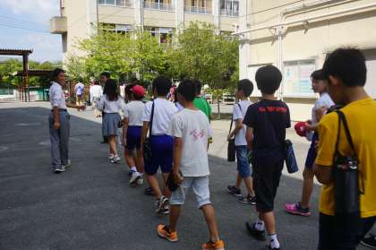 写真は,13時40分の“登校”風景です。中学校生徒会本部役員の生徒たちが正門まで迎えに出ました。今年は,両小学校の児童が同じ時間に登校してくれました。今までは,どちらかの学校が早く来て,もう一方の学校の6年生を待つことが,よくあったものです。開会前なので,特に何もすることもしにくく,手持無沙汰になり,“早く来てくれて申し訳ないな”と思ったものです。ぴったり同じ時間に来てくれ,仲の良い学年になるのかもと,楽しみになりました。