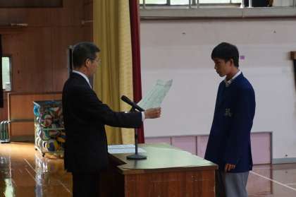 認証式とあわせて,秋の作品展や公式戦で優秀な成績を納めた生徒への表彰が行われました。今回は,“京都府立植物園植物作品展・京都府立植物園長賞”,“西京少年補導委員会生徒児童画展・金賞,銀賞等”,京都市中学校秋季新人大会・ソフトテニス競技男子 第3位”と,頑張った生徒たちへの表彰でした。