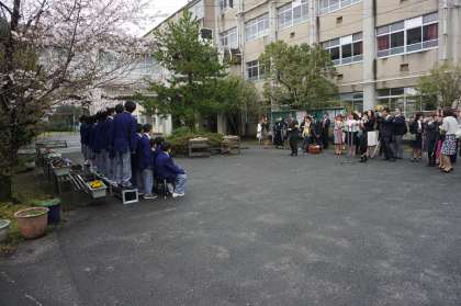 朝まで続いた雨もやみ,中庭で学級写真の撮影を行いました。各クラスごとの撮影ですが,生徒よりたくさんの人数の保護者の皆さんがカメラを向けていらっしゃいました。バックには見ごろを迎えた桜。ベストタイミングのベストショットがおさめられたのではないでしょうか。
