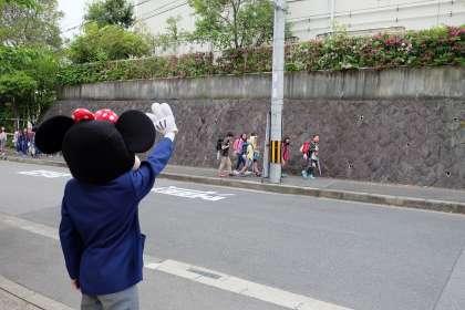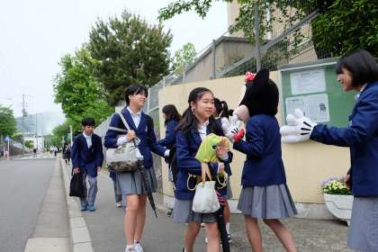 今日は午後から雨となる予報で,どんよりとした天候となりました。でも,洛西中学校の校門では,笑顔があふれる朝となりました。新年度になり,生徒会本部と専門委員長たちが「おはよう」と声をかけながらハイタッチしていくあいさつ運動に,何度か取り組んでくれています。今日は,そのハイタッチに新しいグッズが登場しました。登校してくる本校の生徒はもちろん,境谷小学校の児童たちも,満面の笑顔でした。気持ちの良い朝です。