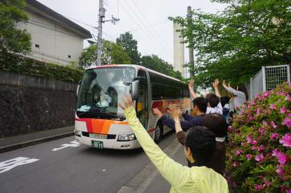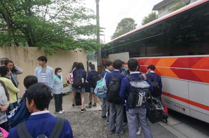 予定通り,8時15分にバスで京都駅に向け出発。9時58分のひかり462号で静岡駅に向かいます。日曜日の朝にもかかわらず,保護者の方や1・2年の先生に見送られ,バスは発車しました。昨日まで少し体調があるかった生徒もいたようですが,概ね元気な様子です。