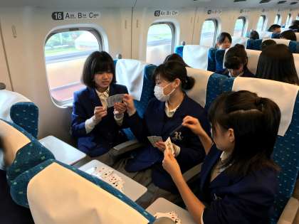 新幹線の中の様子が,写真で送られてきました。早々におやつ、トランプです。今日のお昼は,車内で食するお弁当です。(「朝早くからの準備,ありがとうございました。」感謝して食べましょう!)