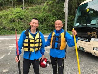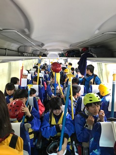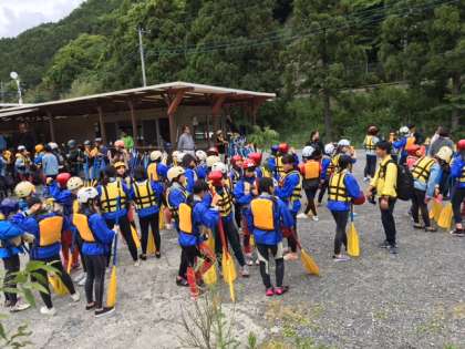 本日のメインメニュー「富士川ラフティング」のようすです。静岡駅からバスで約1時間,ラフティングでお世話になる「シャイニングフィールド」に到着です。バス内で諸注意を受けた後,ウエットスーツに着替えパドルを受け取り,出発地点まで再びバスで移動します。先生(ガイドさんではありません。似合いすぎです。)も一緒に体験をします。張り切っていってらっしゃい!!