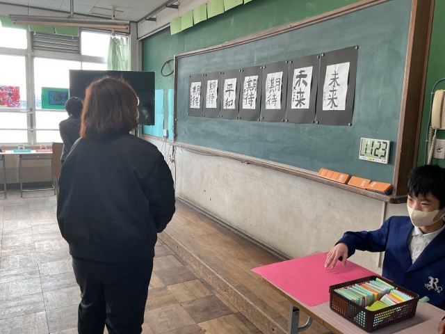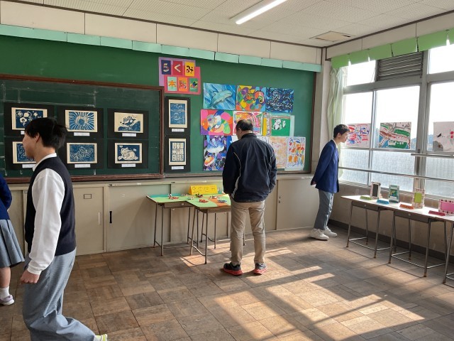 書道や絵画に版画、粘土作品、木工作品など日頃の授業の成果を自分たちで紹介してくれました。