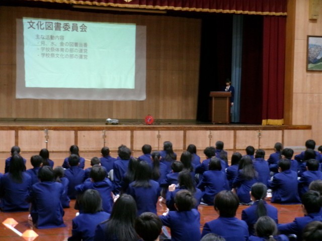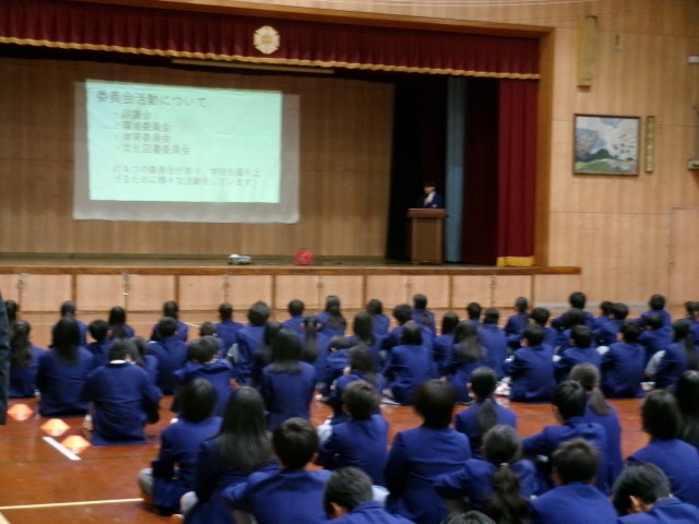 4月10日(金)5・6限に、「新入生を迎える会・生徒会オリエンテーション」が、生徒会本部の主催で行われました。クラスのプラカードを掲げた本部役員生徒の先導と吹奏楽部の演奏とともに1年生が入場し、生徒会本部役員生徒からから中学校での生活についての説明が行われました。次に各種委員会の取り組みについても説明があり、1年生の皆さんはそれぞれの説明をしっかりと聞くことができ、これからの中学校生活のイメージを描き、大きな期待を抱くことができたと思います。