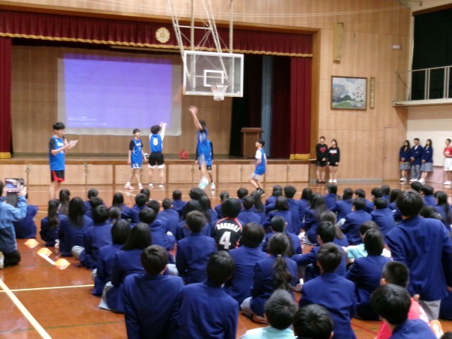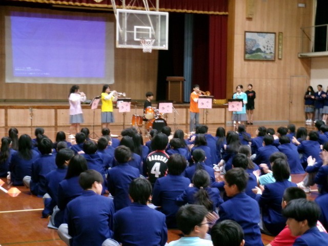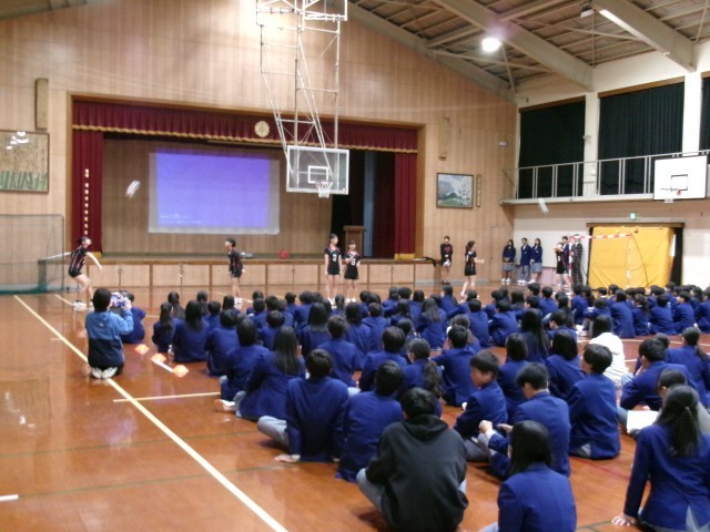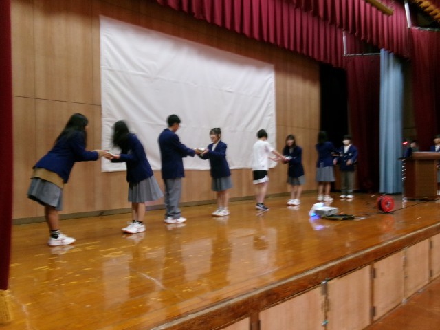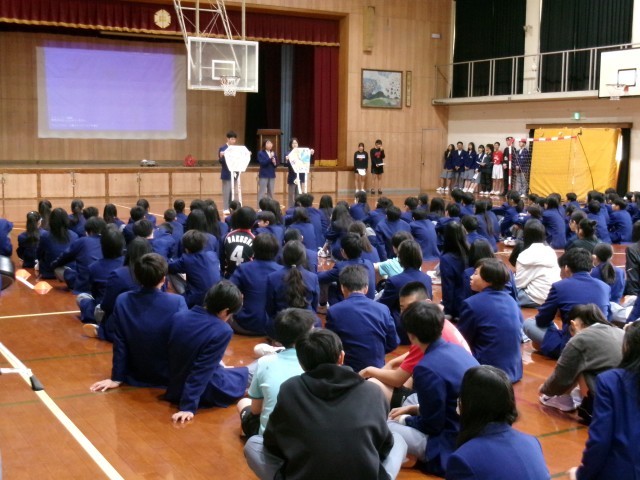 続いて2年生・3年生の各部代表の生徒による部活動紹介が行われました。部活動を楽しみにしている1年生も多いと思います。1年生は先輩の実演や説明を熱心に聞いていました。今後の部活動見学や体験で、自分に合った部活動をぜひ見つけてほしいと思います。最後に生徒会役員から1年生代表生徒に記念品の贈呈が行われ、2・3年の先輩たちの心のこもった新入生を迎える会は、楽しく優しく終了しました。
