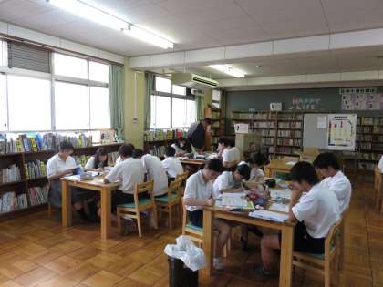 環境月間でもある6月中旬より,2年生の保健体育の授業で「健康と環境」の学習を行っています。洛西図書館から環境の本をお借りし,本校図書室で調べ学習に取り組んでいます。 テーマは「環境の変化に対するからだの働きについて」,「温度と明るさの観点より,健康と環境のかかわりについて」,「空気の健康に対する影響について」などです。各自がそれぞれのテーマについて,調べ,考えをまとめています。この学習で健康や環境のことに興味をもち,今後もさらに疑問に思ったことを深め調べてほしいものです。