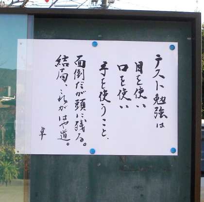 明日からテスト初日まで休日が祝日を含めて3日あります。その3日に勉強をどれほどするかがポイントになってくるのではないでしょうか。しかし校長室だよりに述べたように勉強に早道はありません。「急がばまわれ」の言葉どおりじっくり取り組むことだと思います。