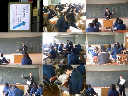 12月4日に受験対策冬季講座を始めました。この取組は12月4日から冬季休業日を除いて5週連続で実施します。その第1回目は明徳高校から藤木先生を講師にお招きして国語の受験講座をして頂きました。90分の講座が2回続くので生徒には辛い部分があったかもしれませんが、よく食いついていたように思います。次回は数学で西山高校から講師をお迎えします。