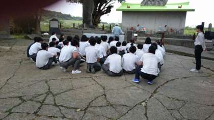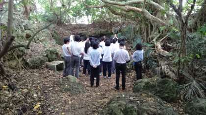 当時の沖縄の様子を真剣に聞いています。また,ガマの中で黙祷を捧げたのち,[ぬちどぅ宝]命こそかけがえのない宝だということを真っ暗な中で感じました。