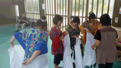 本部小学校分校にて衣装体験。昨日の夜にシュシュをつくり、お揃いの色違いの服を貸していただき体育館へ。今から着替えて民族衣装に!