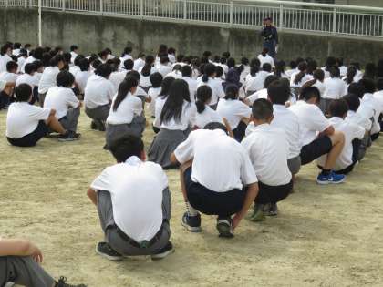 本日,6時間目に西京消防署の指導の下,避難訓練を行いました。南館1Fの配膳室から出火したという想定で煙幕を焚き訓練を行いました。生徒たちの避難行動はとてもすばやく,避難指示が出てから避難完了,生存確認まで3分57秒でした。避難の様子も姿勢を低くしたり,校舎内では走らず冷静にしっかりと行えていました。全校集合したグランドで西京消防署の担当者の方から火災による避難について話していただきました。いつ,どこで火災に会うかわかりません。夏休み家族で旅行に出かける人もいるかもしれませんが,部屋からの避難通路を確認して,いざという時の備えと心構えをしておきましょう。