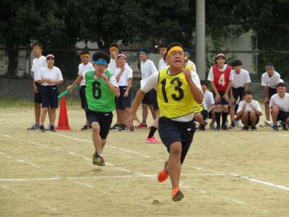 3年生学年種目「全員リレー」クラスで一つのバトンをつなぎました。