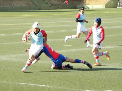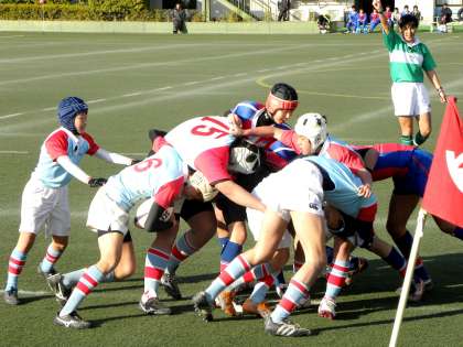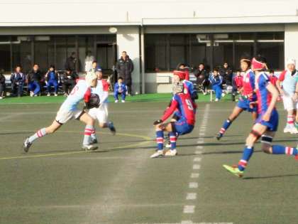 ラグビー新人戦の準々決勝が宝ヶ池球技場で行われました。西陵中の対戦相手は嘉楽中。前半早々に1トライ1ゴールを先行されて7点のビハインドで始まりましたが暫くして1トライを取り返しました。前半からもつれそうな雰囲気を感じる試合展開。その予感通りに両チームともにトライ、ゴールを重ねて前半終了では17−14の3点差で西陵中がややリードして折り返しました。後半に入って嘉楽中の集中力あるゲーム展開でトライを取るのに苦戦。後半戦は12−14で2点差をつけられましたが、前半戦の3点差がものをいって合計29−28という1点差の辛勝でした。嘉楽中の集中力を参考に準決勝も頑張ってほしいものです。