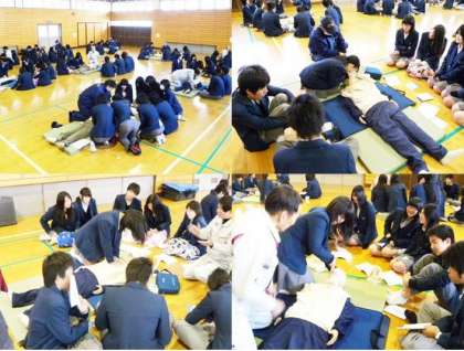 3年生が卒業前に救命実習に取り組みました。西京消防署や地域の分団員の方々のご指導を得て心肺蘇生法の心臓マッサージと最近街角や人が集まる施設に設置されているAEDの扱い方について実習しました。心臓マッサージでは始めは少しハニカミながらしていましたが、時間が経つにつれて上手にマッサージができるようになっていました。AEDも体験できたので家人で救命を要するときは対応できるようになってほしいものです。