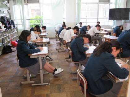 本日,6限に3年生は基礎テストを実施しました。来週に行われる第1回の定期テストに向けて5教科(国語,社会,数学,理科,英語)の基礎的な問題を確認するためのテストです。生徒たちは全力で取り組んでいました。今日からテスト1週間前です。定期テストに備えて家庭学習をしっかり行いましょう。また,放課後の学習会・土曜学習会も活用してください。
