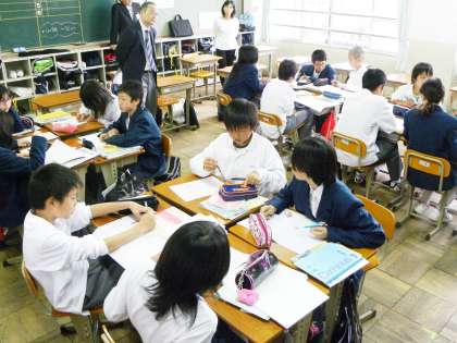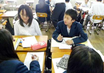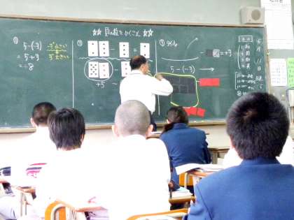 5月11日(水)3限に1年2組で数学科の山口先生が授業研究をされました。正の数と負の数の単元で授業は負の数を引くことについてでした。負の数を引くことについて、温度計やトランプあるいはタイルといった教材を例示しながら、負の数を引くことは正の数を加えることであることを生徒が理解しやすいように進められていました。指導助言は大村主事にしていただきました。