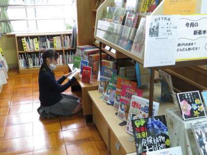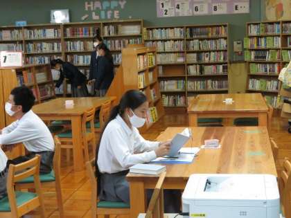 本日から週末にかけて天候が悪く,台風も接近しています。子どもたちは昼休みに図書室で読書を楽しんでいます。