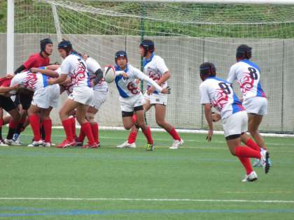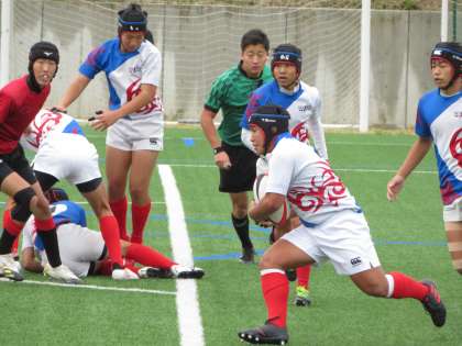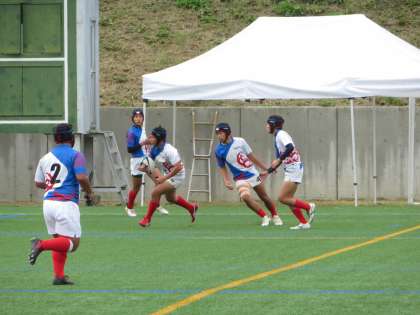 前半10分過ぎに先制のトライを奪い,ゴールも決まり,7−0でリードです。選手達からは「もう一本」と元気な声が響きわたりました。
