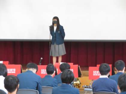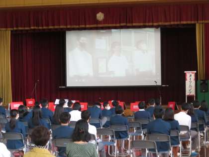 体育館での舞台鑑賞が始まりました。今年度は学年別鑑賞で3部制です。1部は3年生が鑑賞です。1・2年生は教室でのオープニングです。文化委員長のあいさつで始まり,生徒会本部によるオープニング,その後,40周年記念展示制作の様子の紹介です。全校生徒が力を合わせてつくりました。