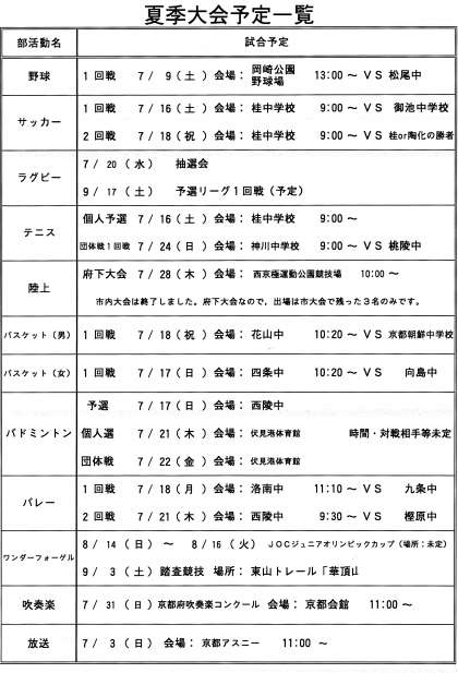 夏季大会の試合日程が決定しました。今回の日程を見てみると夏季休業前の16日からの3連休の間に試合が多く組まれています。早いところでは野球部が7月9日から始まります。夏季大会は3年生にとっては最後の大会です。気力、体力、知力の全てを使って頑張ってください。夏季休業前の全校集会で夏季大会での頑張りを期待して激励したいのですが、1回戦の多くが終わったあとでは悩むところです。画像は明日の9日に夏季大会がある野球部の練習の風景です。