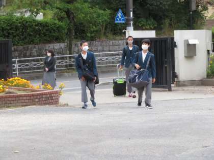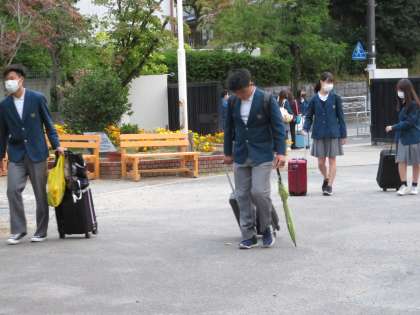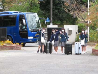 本日から1泊2日で広島方面への修学旅行です。朝から元気に登校しています。バスも到着しました。