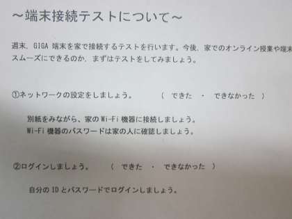 本日GIGA端末を1人1台持ち帰ります。持ち帰ったプリント(端末接続テストについて)にしたがって,ご家庭で接続テストを行ってください。端末は明日9月1日(水)忘れずに持ってきてください。