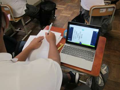 国語科の様子です。短歌の作成に取り組んでいます。生徒の作品に,ほっとさせられます。タブレットなら,席を動かさずとも,作品を共有できますね。